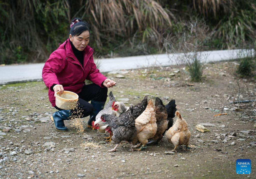 This photo taken on March 5, 2026 shows Wu Zhonghua raising chickens near her home at a forest farm at the Guanshan National Nature Reserve in Yifeng County of east China's Jiangxi Province.(Xinhua/Wan Xiang)