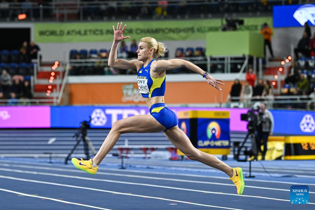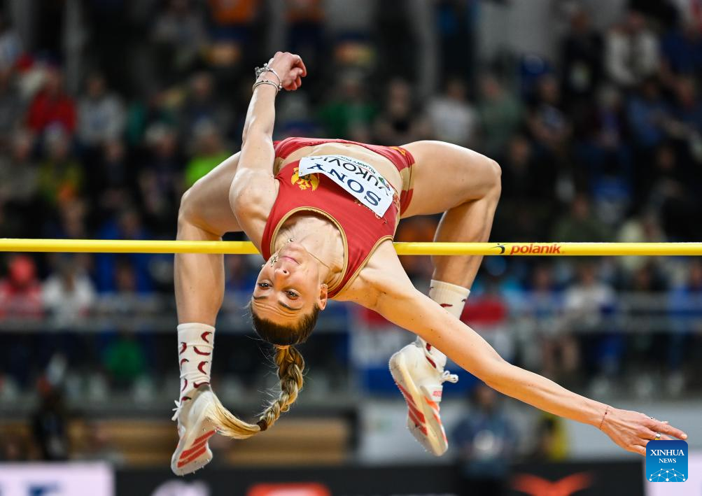 Yuliia Levchenko of Ukraine competes during the women's high jump final at the 2026 World Athletics Indoor Championships in Torun, Poland, March 20, 2026. (Xinhua/Zhang Haofu)