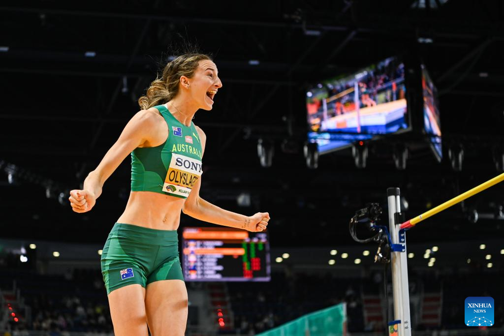 Nicola Olyslagers of Australia celebrates during the women's high jump final at the 2026 World Athletics Indoor Championships in Torun, Poland, March 20, 2026. (Xinhua/Zhang Haofu)