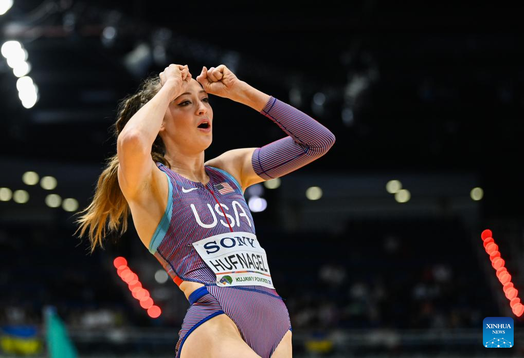 Charity Hufnagel of the Unites States reacts during the women's high jump final at the 2026 World Athletics Indoor Championships in Torun, Poland, March 20, 2026. (Xinhua/Zhang Haofu)
