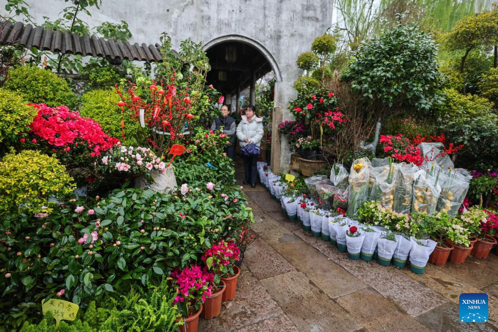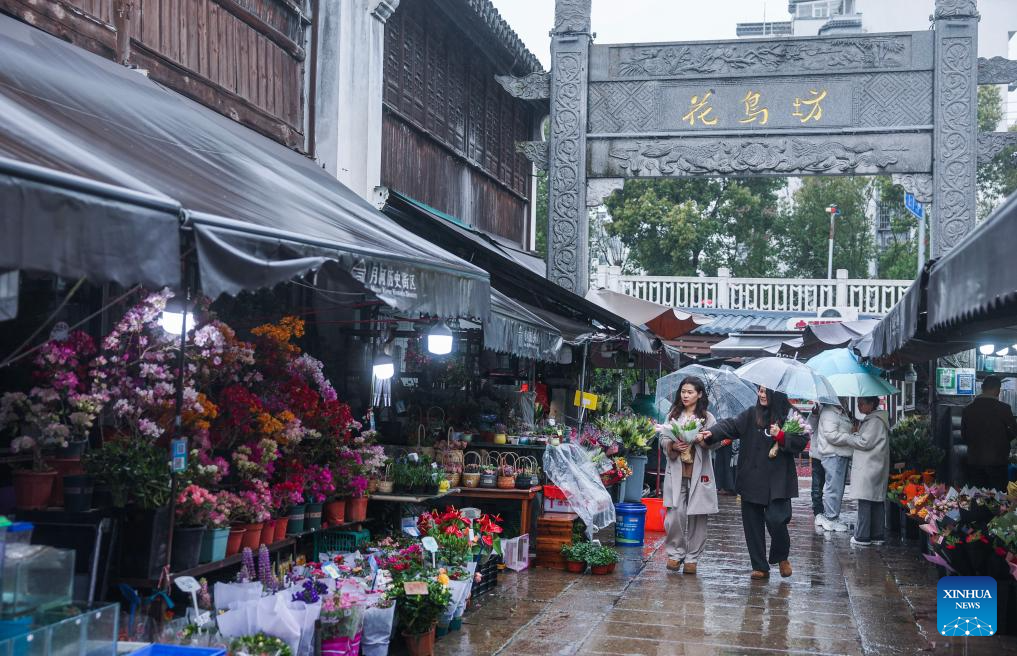 Consumers visit the Yuehe historical and cultural block in Nanhu District of Jiaxing City, east China's Zhejiang Province, March 24, 2026. Recently, the Yuehe historical and cultural block in Nanhu District of Jiaxing City has witnessed a flower consumption boom. In the flower market here, seasonal flowers such as tulips and violets are in full bloom, drawing locals and tourists to purchase. Meanwhile, the flower consumption has also boosted the surrounding catering and cultural and creative industries, bringing vitality to the "spring economy." (Xinhua/Xu Yu)