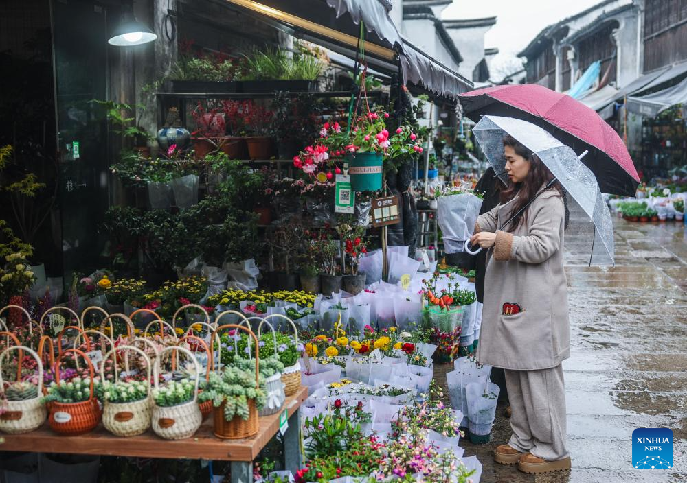 Consumers select flowers at a shop at the Yuehe historical and cultural block in Nanhu District of Jiaxing City, east China's Zhejiang Province, March 24, 2026. Recently, the Yuehe historical and cultural block in Nanhu District of Jiaxing City has witnessed a flower consumption boom. In the flower market here, seasonal flowers such as tulips and violets are in full bloom, drawing locals and tourists to purchase. Meanwhile, the flower consumption has also boosted the surrounding catering and cultural and creative industries, bringing vitality to the "spring economy." (Xinhua/Xu Yu)
