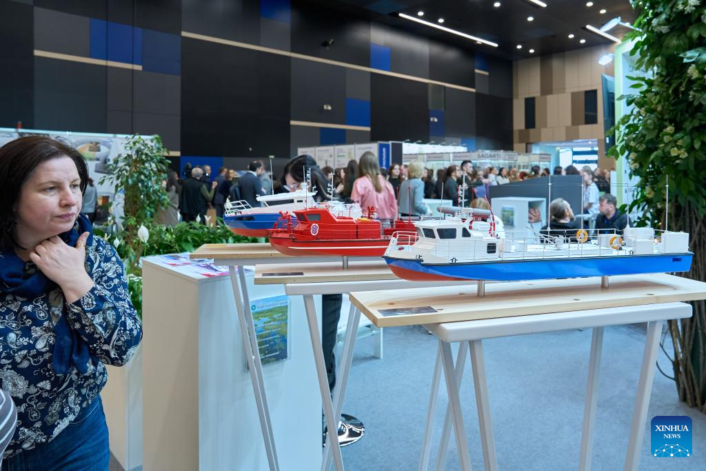 A model of a vessel designed to handle oil spills is exhibited at the "Ecology of a Big City" international environmental forum in St. Petersburg, Russia, March 24, 2026. The forum kicked off here on Tuesday, attracting more than 6,000 participants. (Photo by Guo Feizhou/Xinhua)