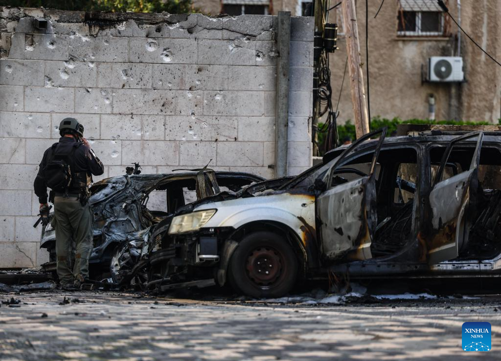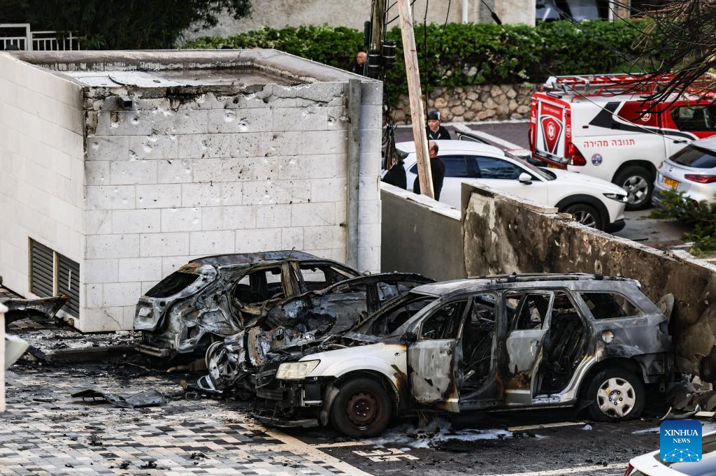 Photo taken on March 26, 2026 shows the site of a rocket attack launched from Lebanon, in Nahariya, northern Israel. A man was killed and another severely injured when a rocket from Lebanon hit the city of Nahariya in northern Israel on Thursday afternoon, according to Israel's Magen David Adom ambulance service. (JINI via Xinhua)