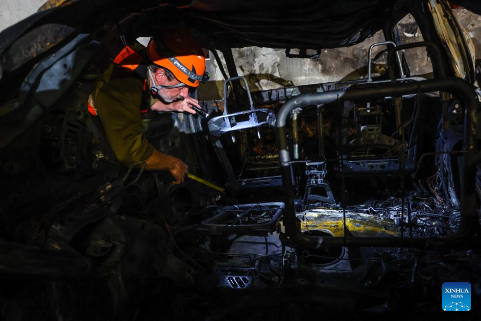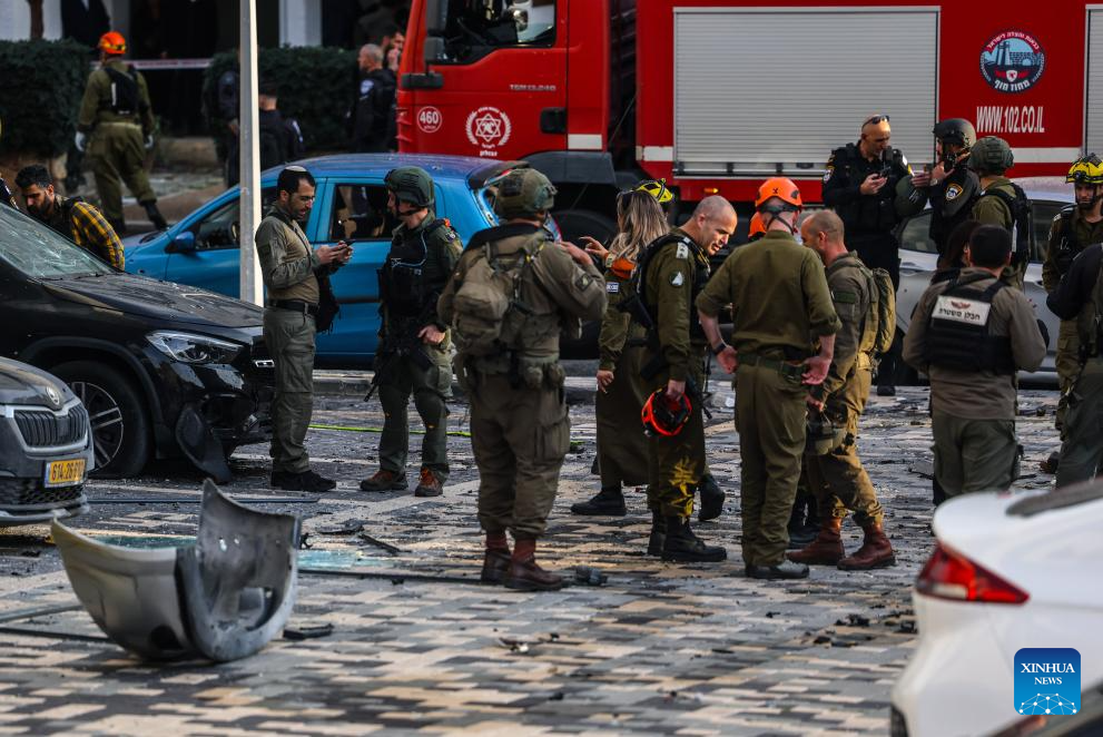 Israeli security and rescue forces work at the site of a rocket attack launched from Lebanon, in Nahariya, northern Israel, March 26, 2026. A man was killed and another severely injured when a rocket from Lebanon hit the city of Nahariya in northern Israel on Thursday afternoon, according to Israel's Magen David Adom ambulance service. (JINI via Xinhua)