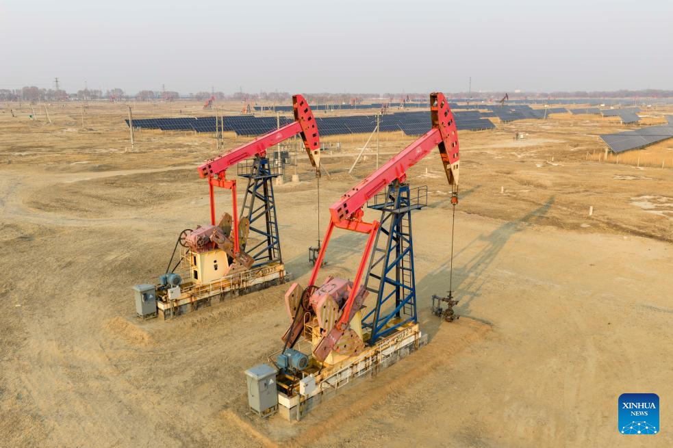 An aerial drone photo taken on March 25, 2026 shows the pumpjacks at the low-carbon demonstration zone of Lamadian Oilfield in Daqing, northeast China's Heilongjiang Province. As an important energy production base in China, Daqing Oilfield has been exploring new pathways for green transformation and development in recent years. While maintaining stable production of traditional energy, it has actively promoted the construction of photovoltaic, wind power and geothermal energy projects. (Xinhua/Wang Song)