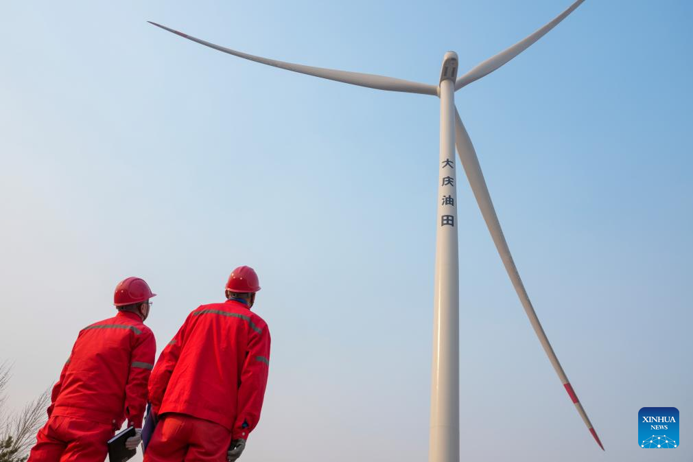 Technicians check the operation of the wind power equipment at the low-carbon demonstration zone of Lamadian Oilfield in Daqing, northeast China's Heilongjiang Province, March 25, 2026. As an important energy production base in China, Daqing Oilfield has been exploring new pathways for green transformation and development in recent years. While maintaining stable production of traditional energy, it has actively promoted the construction of photovoltaic, wind power and geothermal energy projects. (Xinhua/Wang Song)
