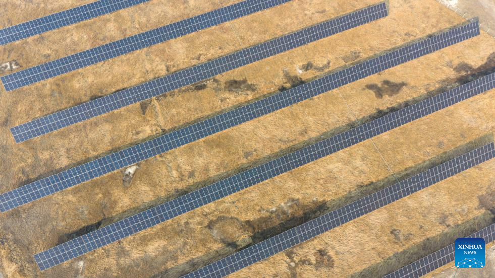 An aerial drone photo taken on March 25, 2026 shows the photovoltaic panels at the low-carbon demonstration zone of Lamadian Oilfield in Daqing, northeast China's Heilongjiang Province. As an important energy production base in China, Daqing Oilfield has been exploring new pathways for green transformation and development in recent years. While maintaining stable production of traditional energy, it has actively promoted the construction of photovoltaic, wind power and geothermal energy projects. (Xinhua/Wang Song)