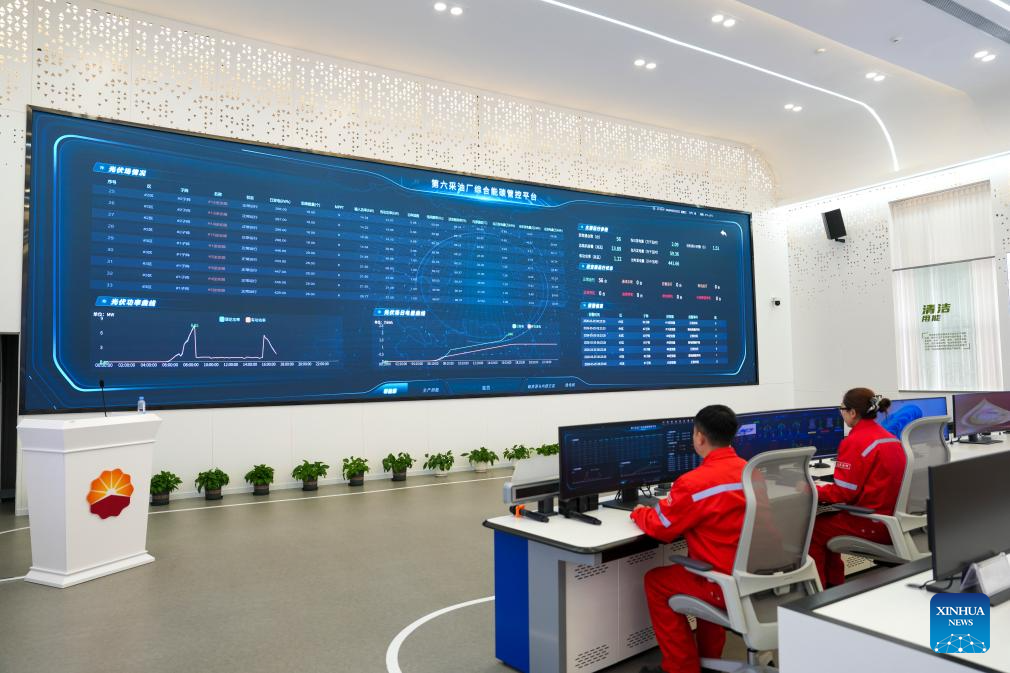 Staff members monitor the operation data of new energy equipment at the intelligent command center of Lamadian Oilfield in Daqing, northeast China's Heilongjiang Province, March 25, 2026. As an important energy production base in China, Daqing Oilfield has been exploring new pathways for green transformation and development in recent years. While maintaining stable production of traditional energy, it has actively promoted the construction of photovoltaic, wind power and geothermal energy projects. (Xinhua/Wang Song)