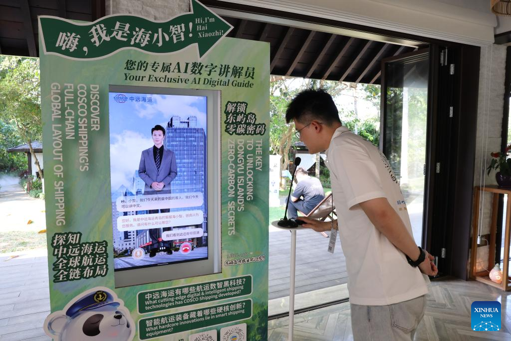 A staff member talks with an AI digital docent during the Boao Forum for Asia (BFA) Annual Conference 2026 in south China's Hainan Province, March 25, 2026.