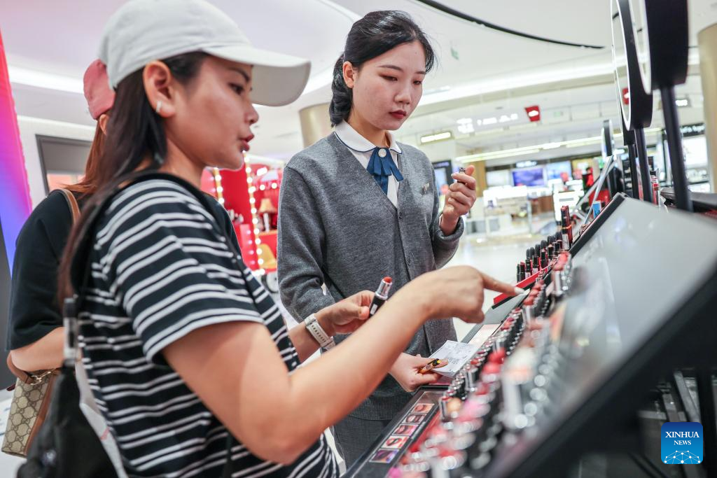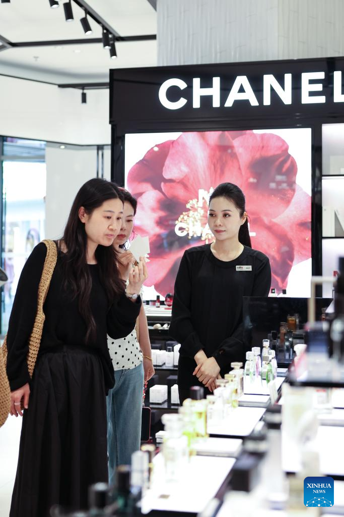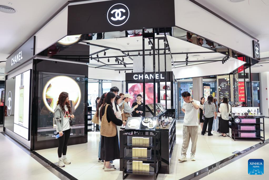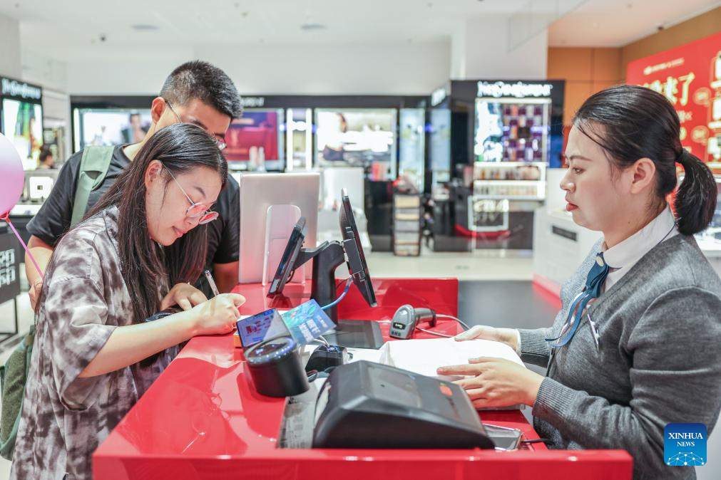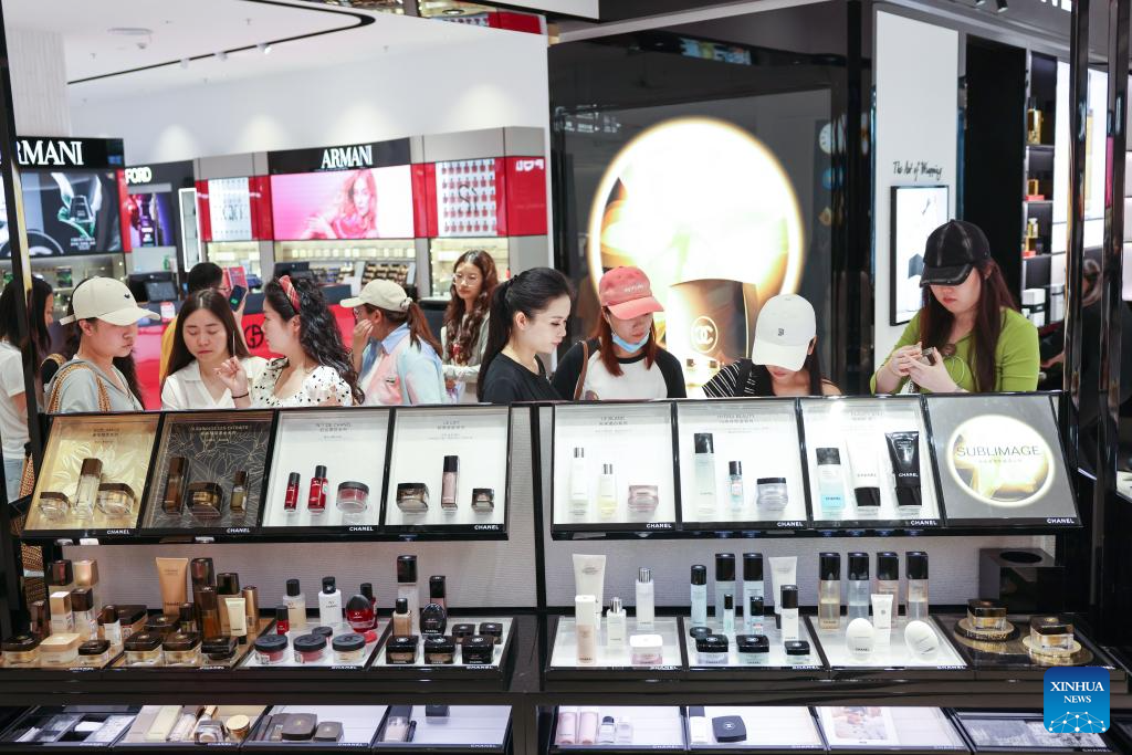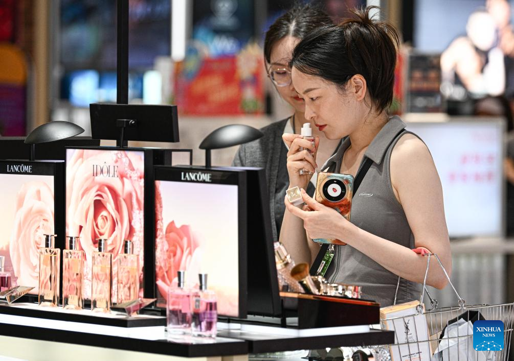 Customers shop at the Haikou Riyue Plaza Duty Free Shop in Haikou, south China's Hainan Province, March 25, 2026. The Hainan Free Trade Port (FTP), the world's largest free trade port by area, marks the 100th day of island-wide special customs operations on Friday, the launch of which represented a milestone in the FTP's journey toward becoming a world-class, high-level free trade port. (Xinhua/Zhang Liyun)