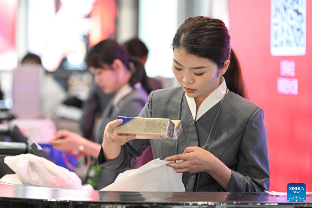 A staff member packs products for customers at a duty free shop in Boao, south China's Hainan Province, March 27, 2026.