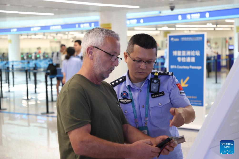 A police officer offers help to an inbound passenger with entry procedures at Meilan International Airport in Haikou, south China's Hainan Province, March 27, 2026. The Hainan Free Trade Port (FTP), the world's largest free trade port by area, marks the 100th day of island-wide special customs operations on Friday. In the course of the past 100 days, the number of visa-free inbound passengers jumped by over 54 percent year on year. (Photo by Wang Yu/Xinhua)