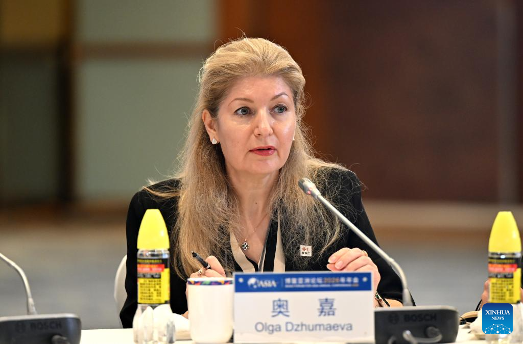 Olga Dzhumaeva, head of East Asia Delegation of International Federation of Red Cross and Red Crescent Societies, speaks at a panel discussion themed on "Unlocking the Potential of Asia's Silver Economy Market and Creating Value through Collaboration" during the Boao Forum for Asia (BFA) Annual Conference 2026 in Boao, south China's Hainan Province, March 27, 2026. (Xinhua/Guo Cheng)