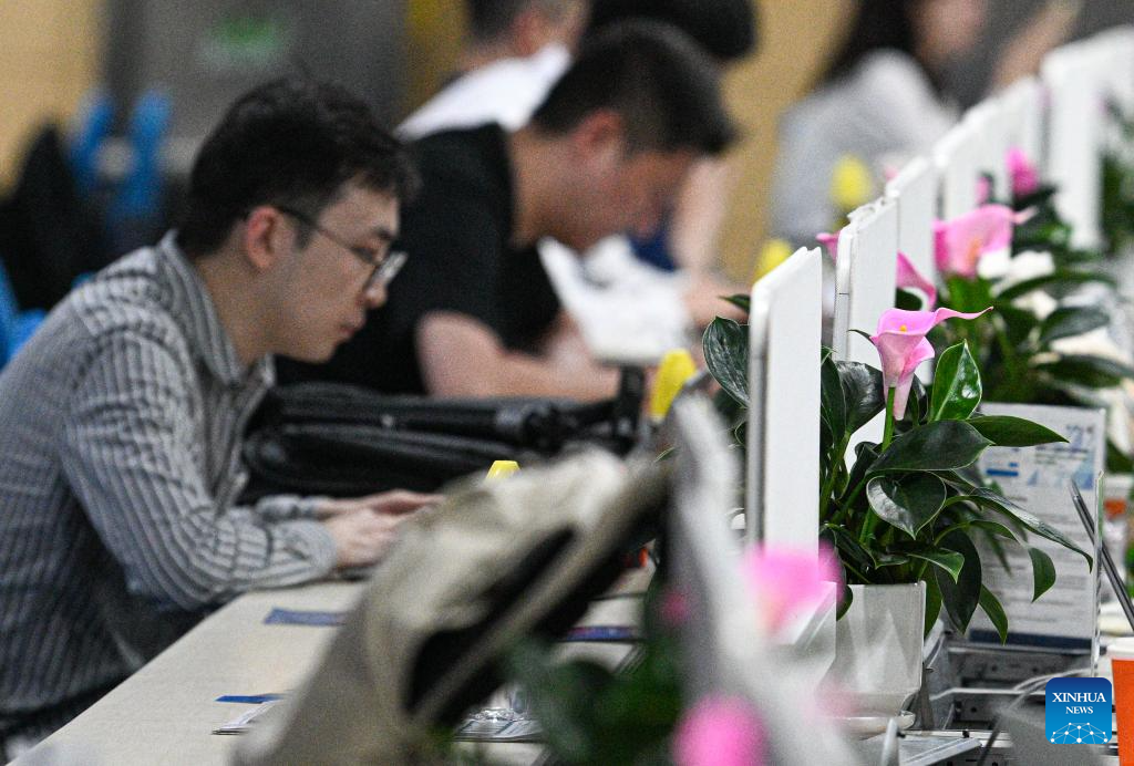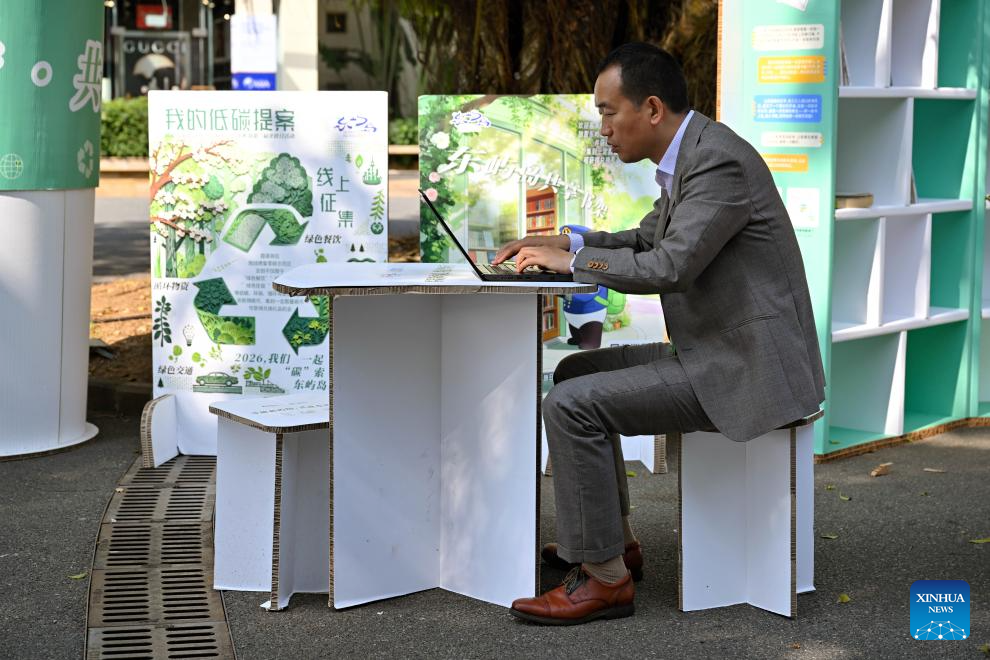 A participant works on a desk and chair made from recycled paper at the venue of Boao Forum for Asia (BFA) Annual Conference 2026 in Boao, south China's Hainan Province, March 25, 2026. Since the Boao Forum for Asia (BFA) was established 25 years ago, the concept of green operations has remained a steadfast principle of its annual conferences. This year's conference has further deepened green practices throughout the process, integrating sustainable development into all aspects such as venue operations, transportation support, conference services, among others. (Xinhua/Guo Cheng)