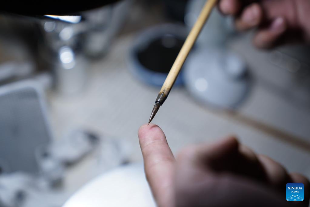 Cao Lang showcases a specialized brush for blue-and-white porcelain painting at the studio in Jingdezhen, east China's Jiangxi Province, March 11, 2026. (Xinhua/Zhou Mi)
