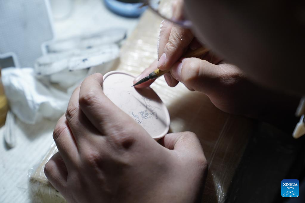 Hu Yunyue creates at the studio in Jingdezhen, east China's Jiangxi Province, March 11, 2026. (Xinhua/Zhou Mi)