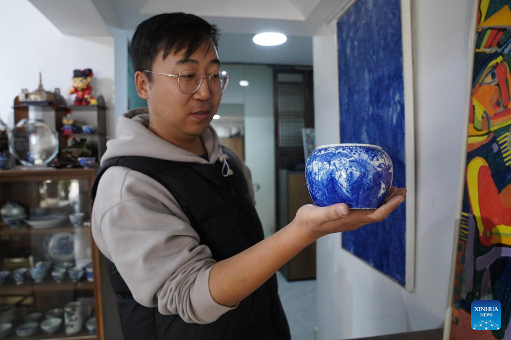 Cao Lang showcases a blue-and-white porcelain tea set at the studio in Jingdezhen, east China's Jiangxi Province, March 11, 2026. (Xinhua/Zhou Mi)
