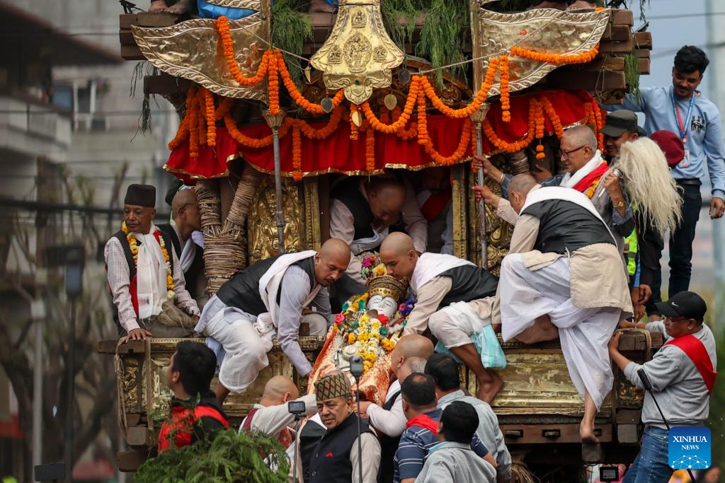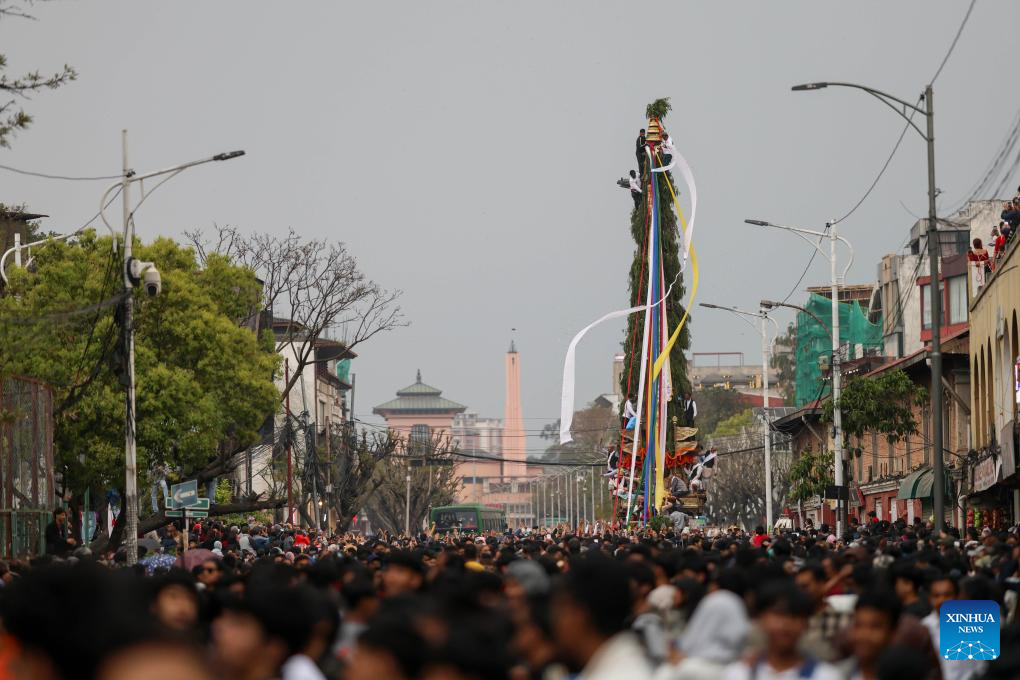 People take part in the Seto Machindranath chariot procession in Kathmandu, Nepal, March 26, 2026. Seto Machindranath is known as the god of rain and both Hindus and Buddhists worship Machindranath for good rain. (Photo by Sulav Shrestha/Xinhua)