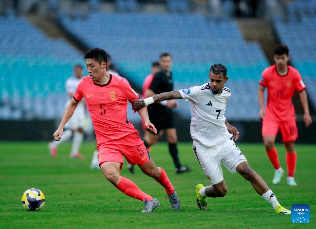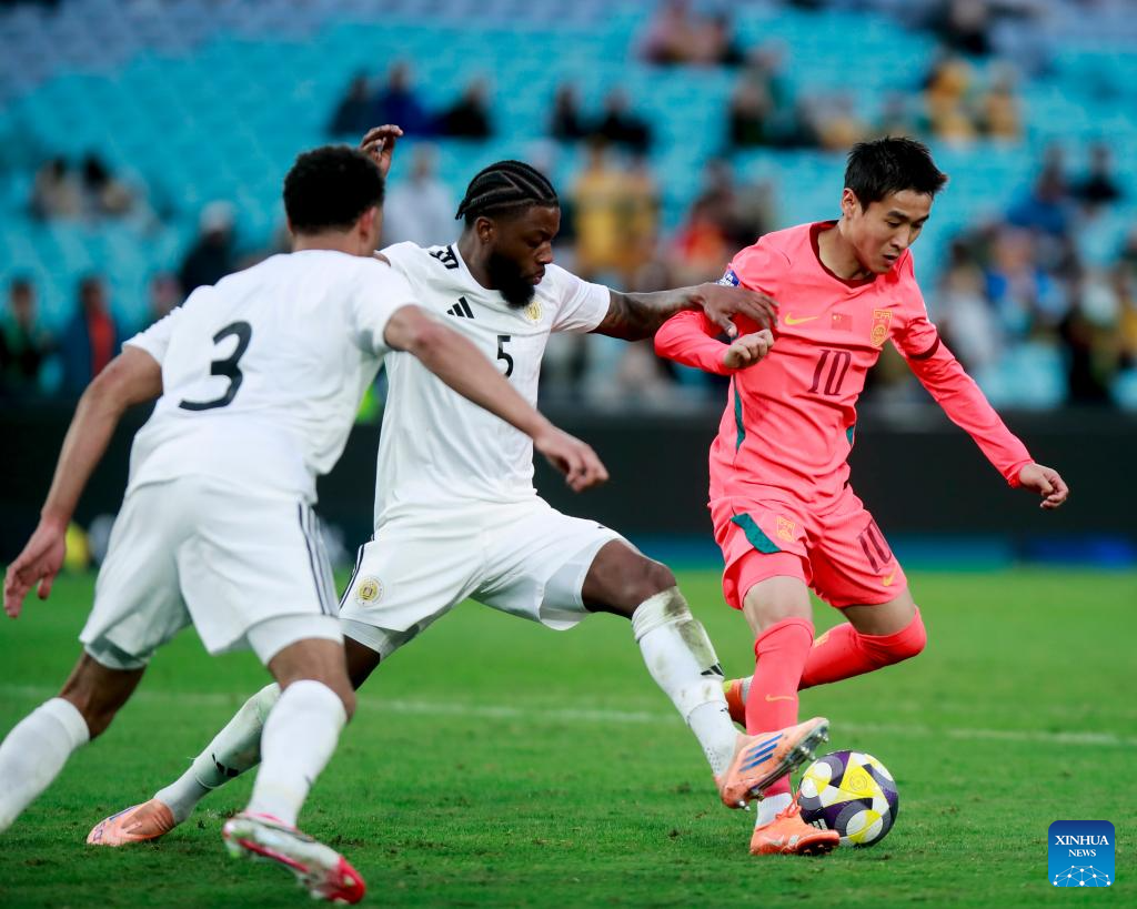 Wei Shihao (R) of China vies with Sherel Floranus (C) of Curacao during the FIFA Series 2026 International Friendly Match between China and Curacao in Sydney, Australia, March 27, 2026. (Xinhua/Ma Ping)