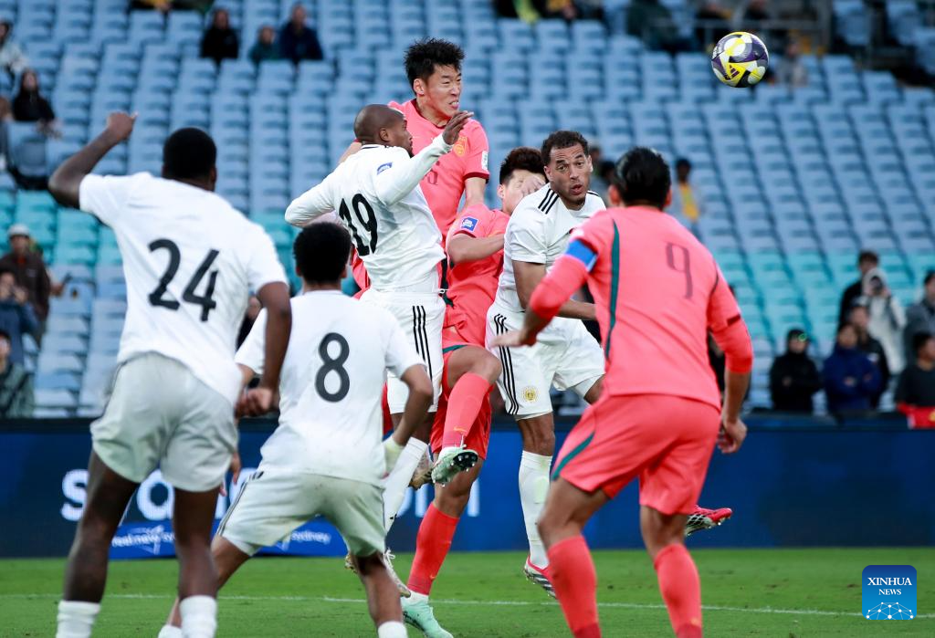 Zhu Chenjie (top) of China vies for a header during the FIFA Series 2026 International Friendly Match between China and Curacao in Sydney, Australia, March 27, 2026. (Xinhua/Ma Ping)