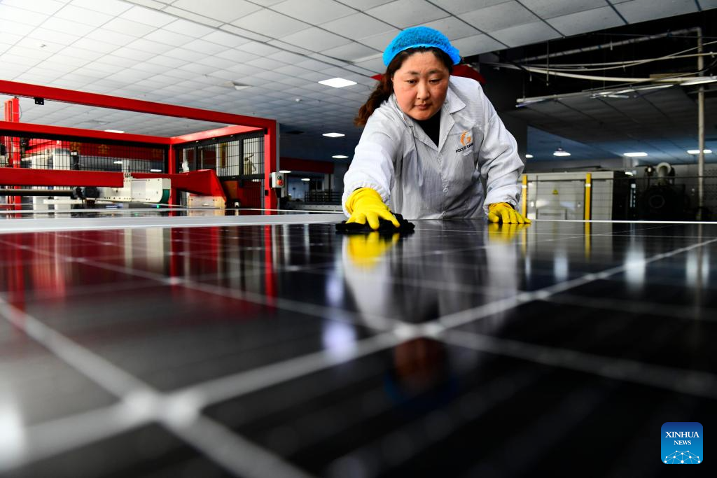 A staff member cleans photovoltaic panels in Juxian County of Rizhao City, east China's Shandong Province, March 27, 2026. Rizhao has vigorously advanced technological upgrading initiatives, continuously promoting the transformation of traditional industries toward higher-end, intelligent, and green development, while fostering and expanding emerging and future-oriented industries, and striving to build a modern industrial system with distinctive port-based characteristics. (Xinhua/Guo Xulei)