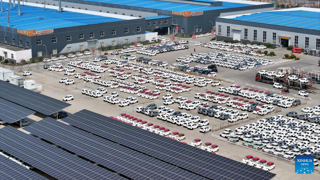An aerial drone photo taken on March 26, 2026 shows the parking lot of a new energy vehicle factory in Wulian County of Rizhao City, east China's Shandong Province. Rizhao has vigorously advanced technological upgrading initiatives, continuously promoting the transformation of traditional industries toward higher-end, intelligent, and green development, while fostering and expanding emerging and future-oriented industries, and striving to build a modern industrial system with distinctive port-based characteristics. (Xinhua/Guo Xulei)