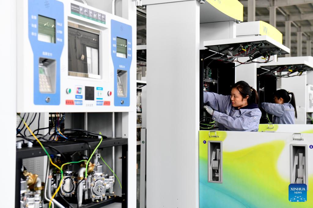 Staff members assemble fueling machines in Juxian County of Rizhao City, east China's Shandong Province, March 27, 2026. Rizhao has vigorously advanced technological upgrading initiatives, continuously promoting the transformation of traditional industries toward higher-end, intelligent, and green development, while fostering and expanding emerging and future-oriented industries, and striving to build a modern industrial system with distinctive port-based characteristics. (Xinhua/Guo Xulei)