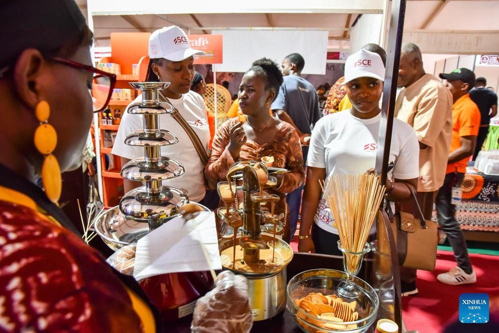 An exhibitor offers chocolate products made from local cocoa to visitors during the Cacao and Coffee Festival 2026 in Yaounde, Cameroon, March 27, 2026. Themed "the Woman at the Heart of the Sectors," the festival, held from March 26 to 28, highlighted women's strategic roles in cocoa and coffee industries. (Photo by Kepseu/Xinhua)