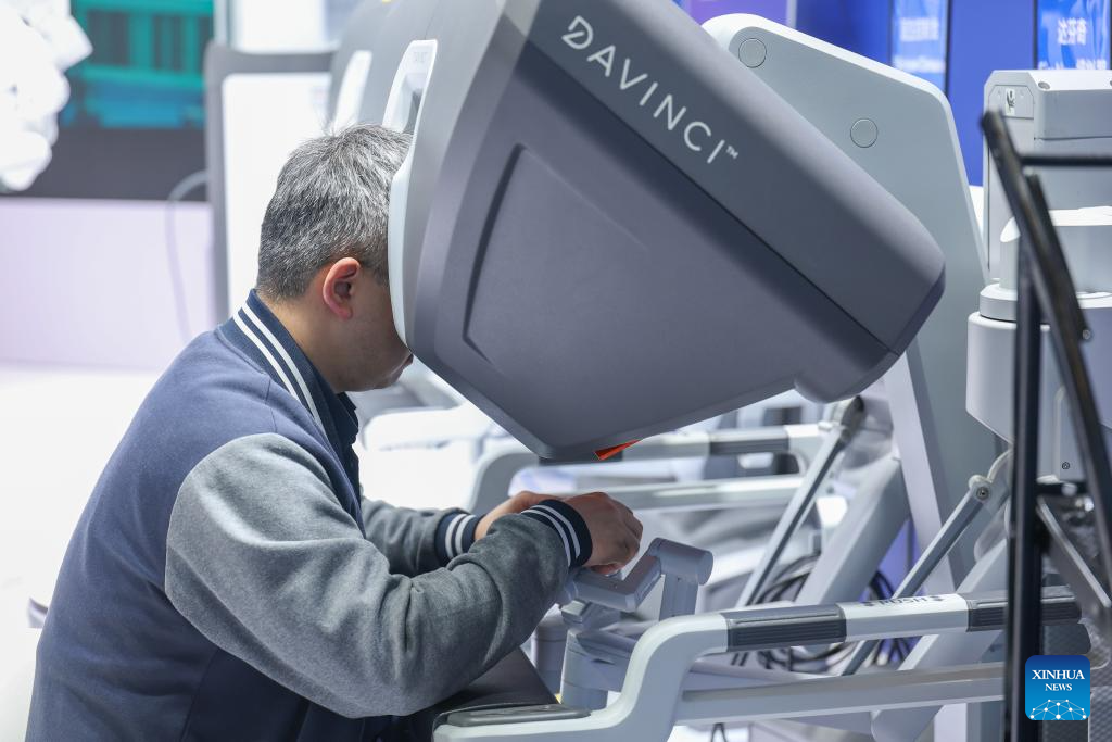 A visitor experiences a surgical robot during the 2026 China Medical Equipment Conference & Medical Equipment Exhibition held at Chongqing International Expo Center in southwest China's Chongqing Municipality, March 29, 2026. The four-day exhibition kicked off here on Thursday, with more than 800 companies participating and showcasing numerous innovative achievements and cutting-edge technologies in medical equipment. (Xinhua/Huang Wei)
