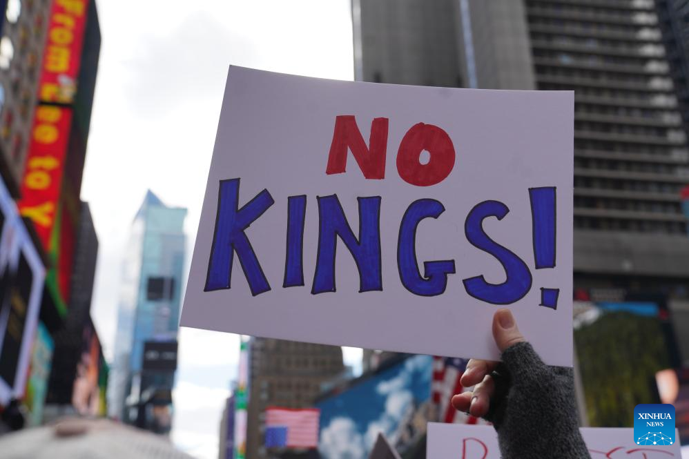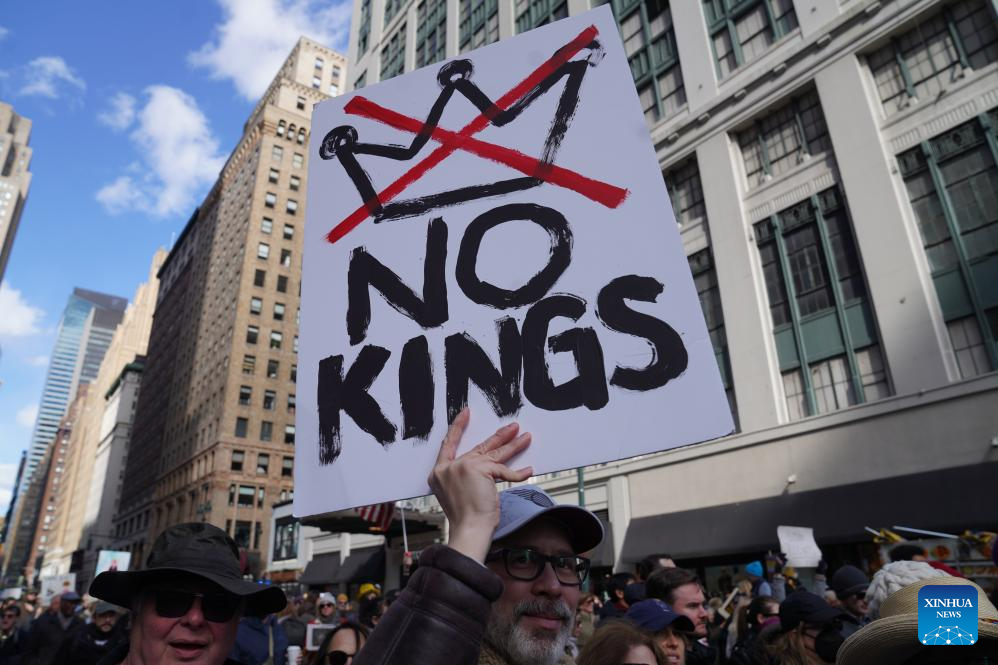 A protester holds a "No Kings" placard during a march in New York, the United States, on March 28, 2026. Millions of Americans took to the streets Saturday in the third wave of "No Kings" rallies across the United States, protesting policies of the U.S. administration, ranging from military action in Iran to controversial immigration enforcement. Over 3,100 demonstrations were planned nationwide and staged in major U.S. cities such as Washington D.C., New York, Boston, Los Angeles and San Francisco. U.S. media reports projected the protests involved some 900,000 people, making it the largest single-day protest event on record. (Xinhua/Zhang Fengguo)