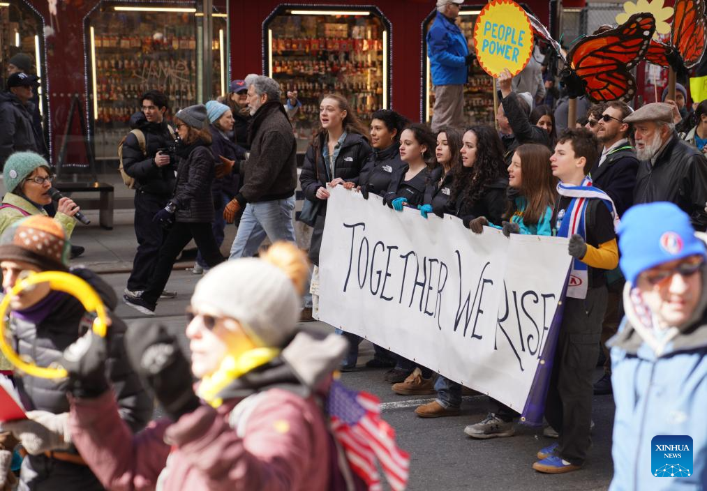"The United States is starting a war that is unjust and unnecessary," Carolyn Rill, a demonstrator, told Xinhua, referring to the ongoing U.S. war on Iran. "They are also taking away money from important services of the U.S. federal government, hurting people's rights."