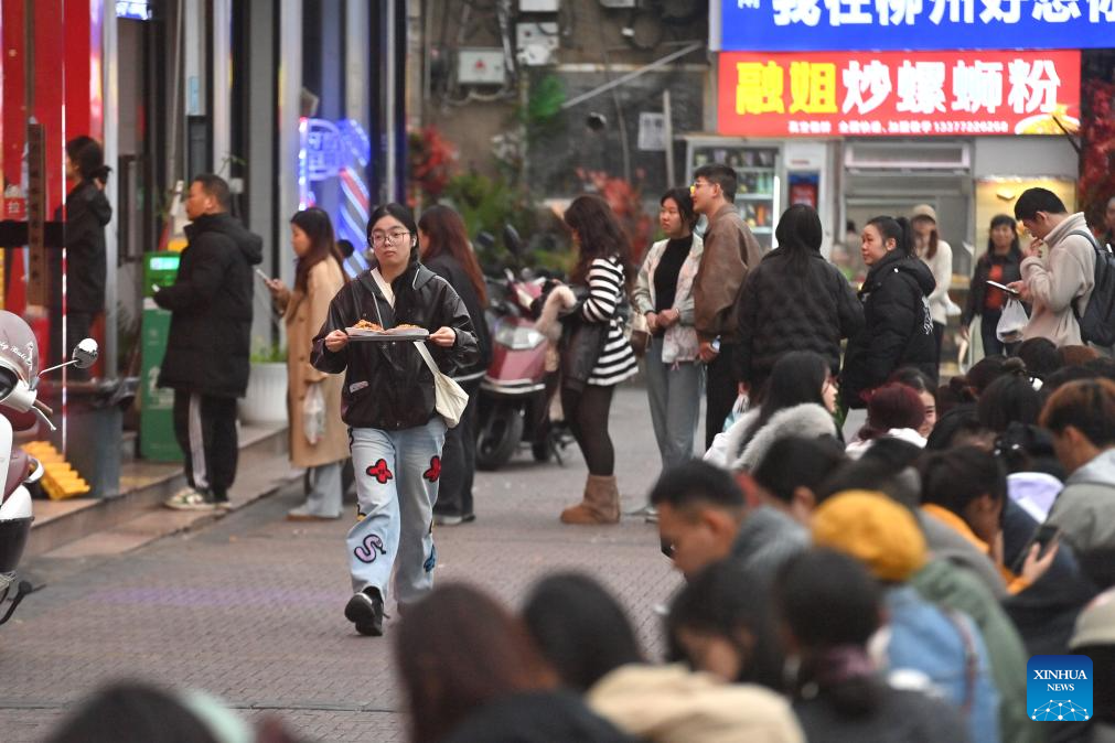 Tourists buy Luosifen at a speciality shop in Liuzhou City, south China's Guangxi Zhuang Autonomous Region, March 10, 2026. In Guangxi, rice noodles are served in many different ways, such as Luosifen, Guilin rice noodles, seafood rice noodles, Nanning Laoyou rice noodles and Shengzha rice noodles, with noodle shops found everywhere from busy streets to small lanes. (Xinhua/Huang Xiaobang)
