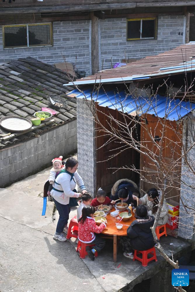 Villagers eat rice noodles at home in Dangjiu Village of Rongshui Miao Autonomous County, south China's Guangxi Zhuang Autonomous Region, Feb. 20, 2026. In Guangxi, rice noodles are served in many different ways, such as Luosifen, Guilin rice noodles, seafood rice noodles, Nanning Laoyou rice noodles and Shengzha rice noodles, with noodle shops found everywhere from busy streets to small lanes. (Xinhua/Huang Xiaobang)