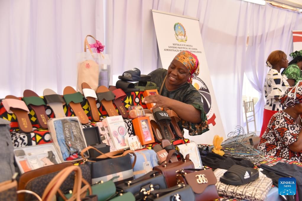 A woman is pictured at a stall during the Women's Meeting of Luanda Province at the Bay of Luanda in Angola, March 28, 2026. More than 100,000 women gathered here on Saturday for the inaugural Women's Meeting of Luanda Province, held under the theme "Women of Luanda, Essence that Transforms." (Photo by Julio Kikebu/Xinhua)