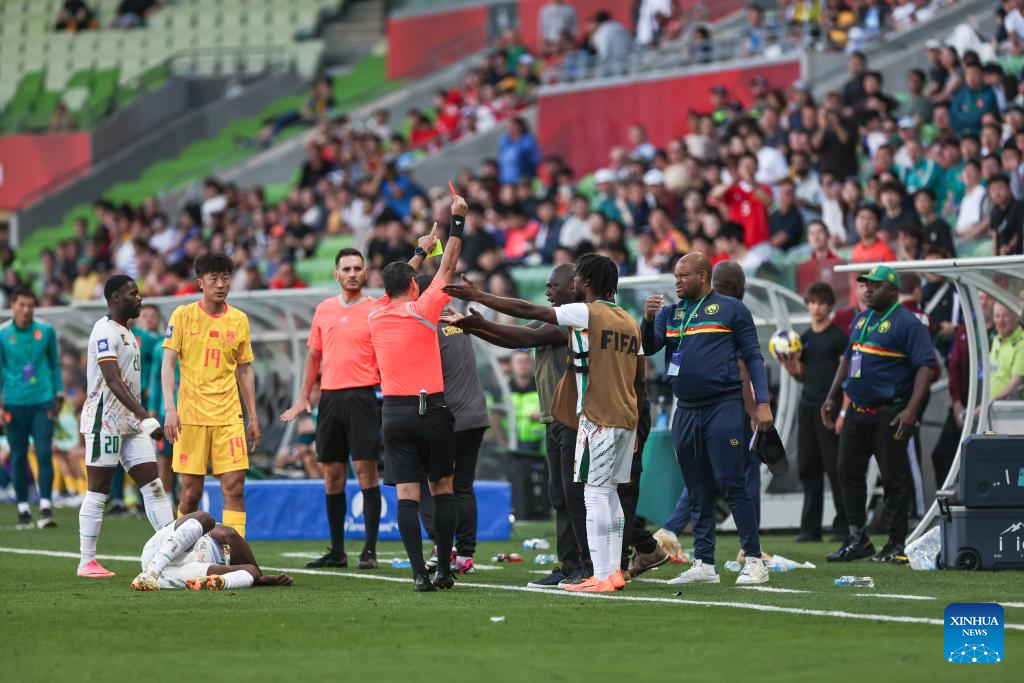 Stephane Keller (1st R) of Cameroon is sent-off by referee for 2nd yellow card during the FIFA Series 2026 International Friendly Match between China and Cameroon in Melbourne, Australia, March 31, 2026. (Photo by Jin Cheng/Xinhua)