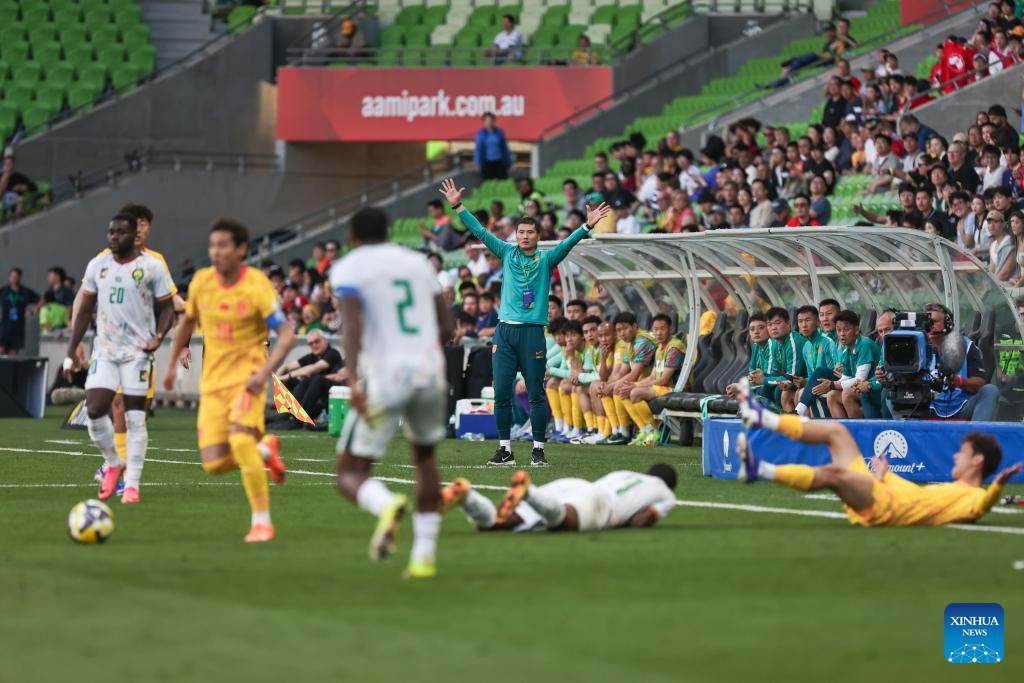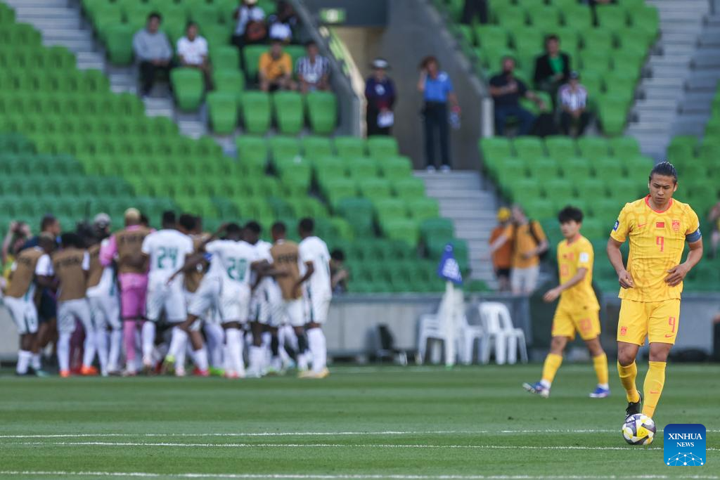 Zhang Yuning (1st R) of China reacts after team Cameroon's first goal during the FIFA Series 2026 International Friendly Match between China and Cameroon in Melbourne, Australia, March 31, 2026. (Photo by Jin Cheng/Xinhua)