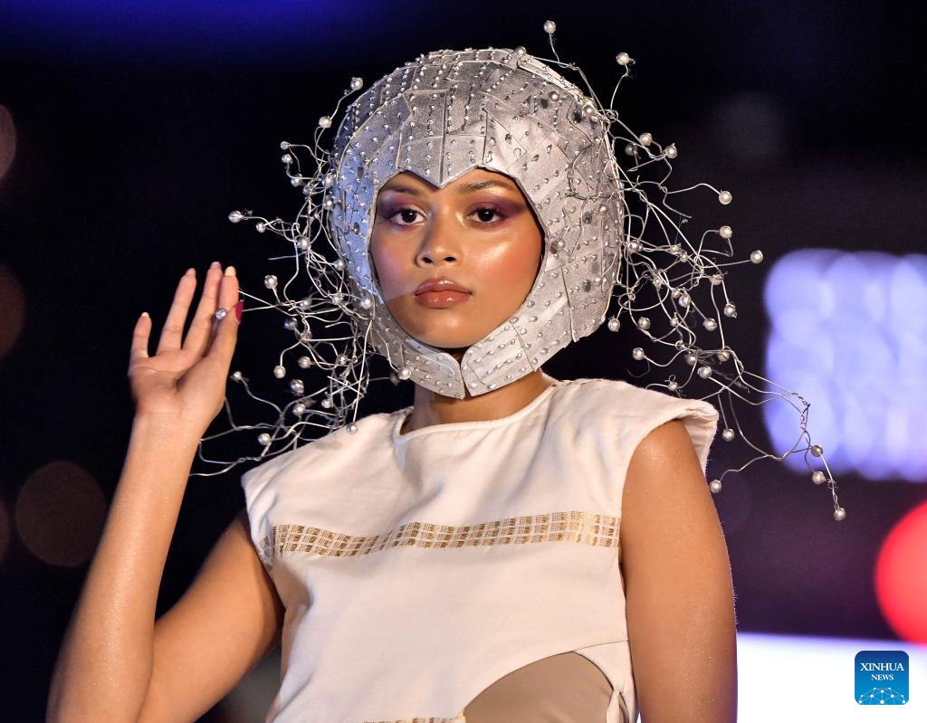 A model presents a creation during the Colombo Fashion Week in Colombo, Sri Lanka on April 1, 2026. The Colombo Fashion Week Summer 2026 takes place from April 1 to 4. The four-day event showcases creations from more than 30 designers. (Photo by Ajith Perera/Xinhua)