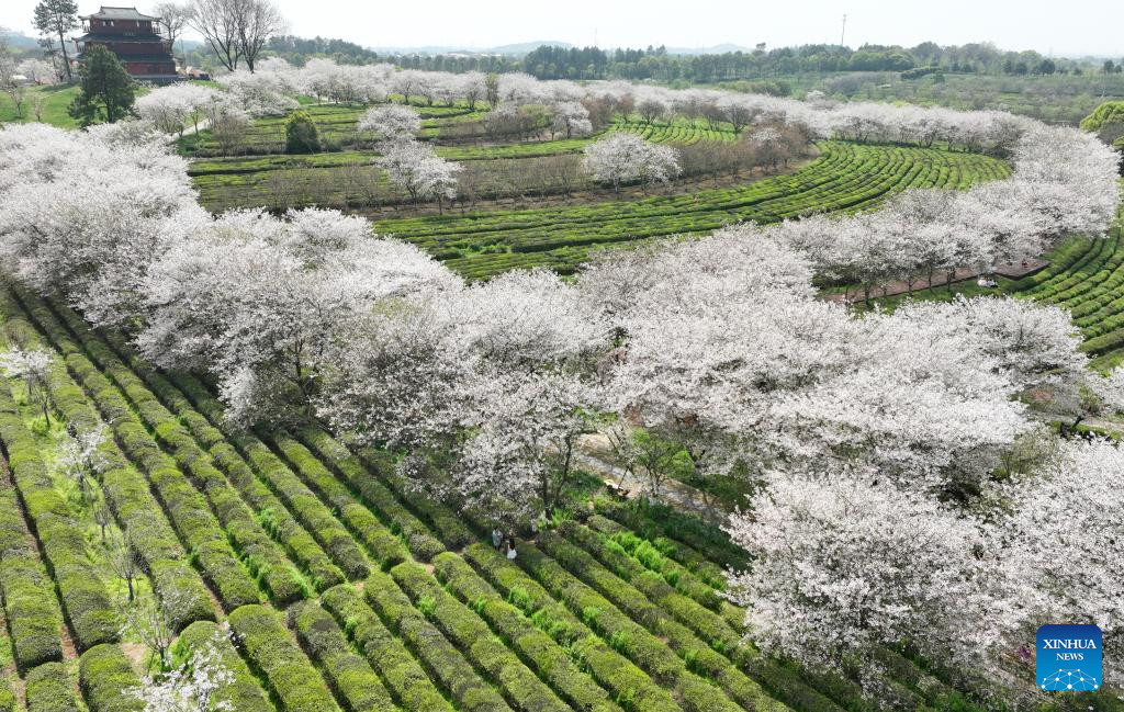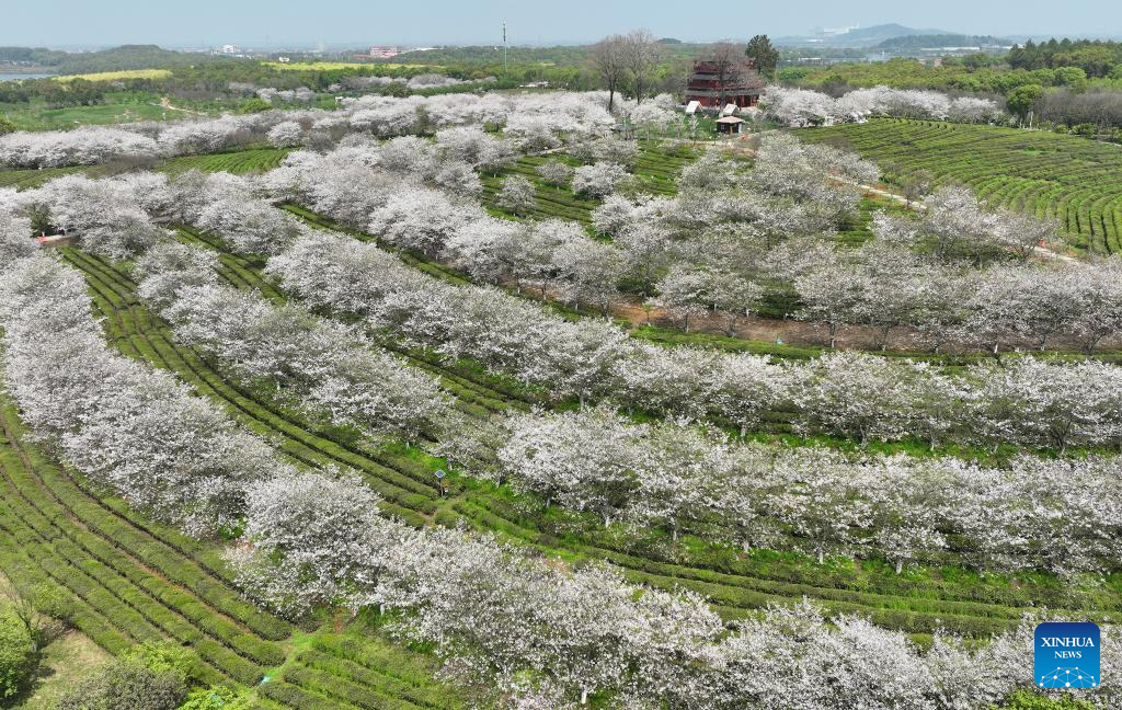 An aerial drone photo taken on April 1, 2026 shows the scenery of cherry blossoms in Nanchang County of east China's Jiangxi Province. (Xinhua/Wan Xiang)