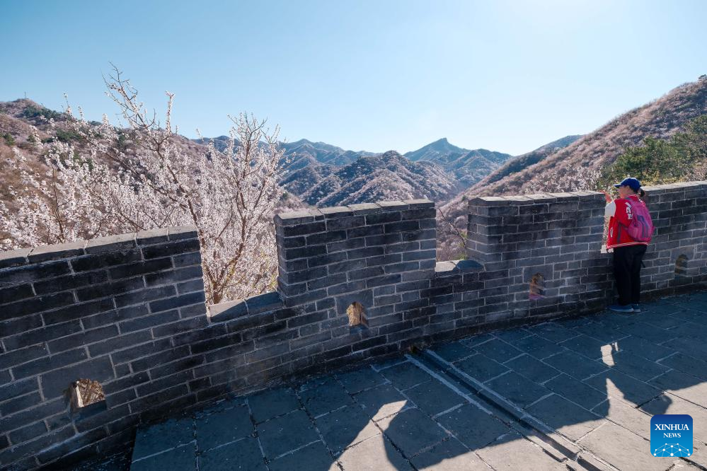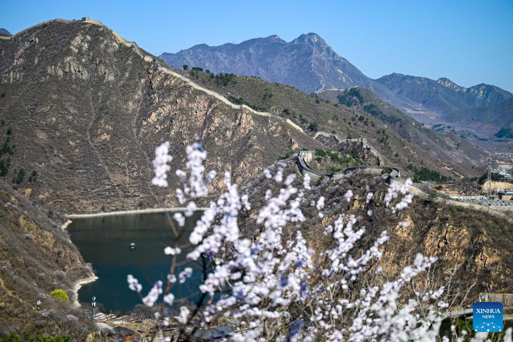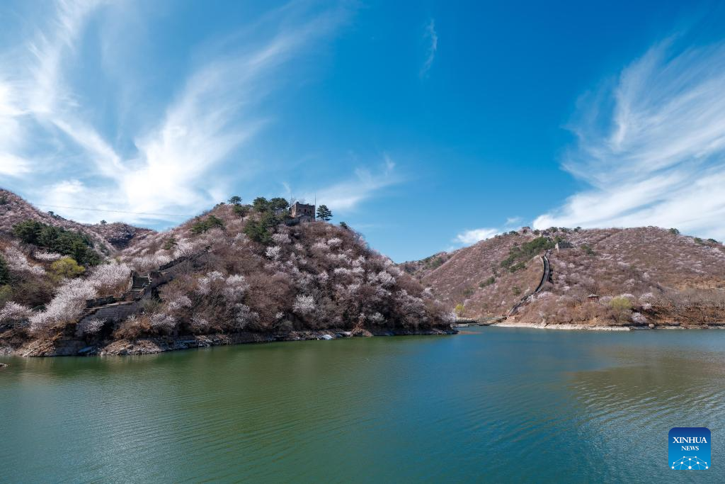 This photo taken on April 1, 2026 shows blooming flowers at Huanghuacheng Lakeside Great Wall in Huairou District of Beijing, capital of China. (Xinhua/Chen Yehua)
