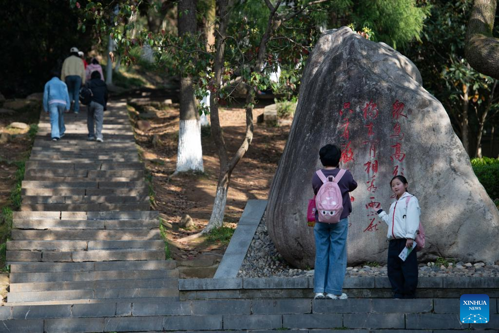 A tourist poses for photos with a stone tablet bearing lines from Chinese poet Li Bai's poetry at Jingting Mountain national forest park in Xuancheng City, east China's Anhui Province, April 2, 2026. Jingting Mountain, celebrated by Li Bai, a legendary Chinese poet of Tang Dynasty (618-907), has long been renowned for its poetic charm. As a core production area of green tea, the mountain is surrounded by more than 10,000 mu (about 666.67 hectares) of tea gardens. In recent years, local authorities have leveraged Jingting Mountain's unique natural resources and cultural heritage to deeply integrate tea cultivation with tourism. Now, many tourists come to experience the delightful blend of tea aroma and poetic landscapes as the tea-harvesting season here has begun. (Xinhua/Zhang Duan)