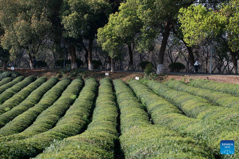 A tourist rides past a tea garden at the foot of Jingting Mountain in Xuancheng City, east China's Anhui Province, April 2, 2026. Jingting Mountain, celebrated by Li Bai, a legendary Chinese poet of Tang Dynasty (618-907), has long been renowned for its poetic charm. As a core production area of green tea, the mountain is surrounded by more than 10,000 mu (about 666.67 hectares) of tea gardens. In recent years, local authorities have leveraged Jingting Mountain's unique natural resources and cultural heritage to deeply integrate tea cultivation with tourism. Now, many tourists come to experience the delightful blend of tea aroma and poetic landscapes as the tea-harvesting season here has begun. (Xinhua/Zhang Duan)