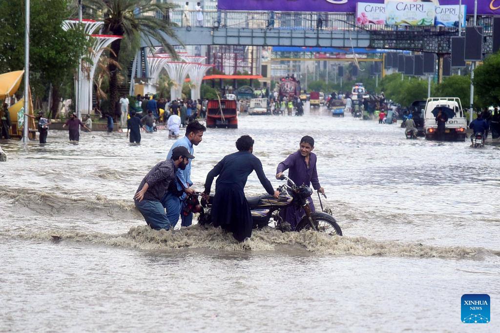 People push a motorbike on a flooded road after a heavy rain in Karachi, Pakistan, April 2, 2026. A fresh spell of heavy rain accompanied by strong winds and thunderstorms wreaked havoc in Pakistan's Balochistan province and southern port city of Karachi, leaving 15 people dead over the last 24 hours, while causing widespread disruption and infrastructure damage. (Str/Xinhua)