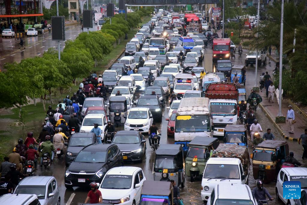 A traffic jam is seen on a road after a heavy rain in Karachi, Pakistan, April 2, 2026. A fresh spell of heavy rain accompanied by strong winds and thunderstorms wreaked havoc in Pakistan's Balochistan province and southern port city of Karachi, leaving 15 people dead over the last 24 hours, while causing widespread disruption and infrastructure damage. (Str/Xinhua)