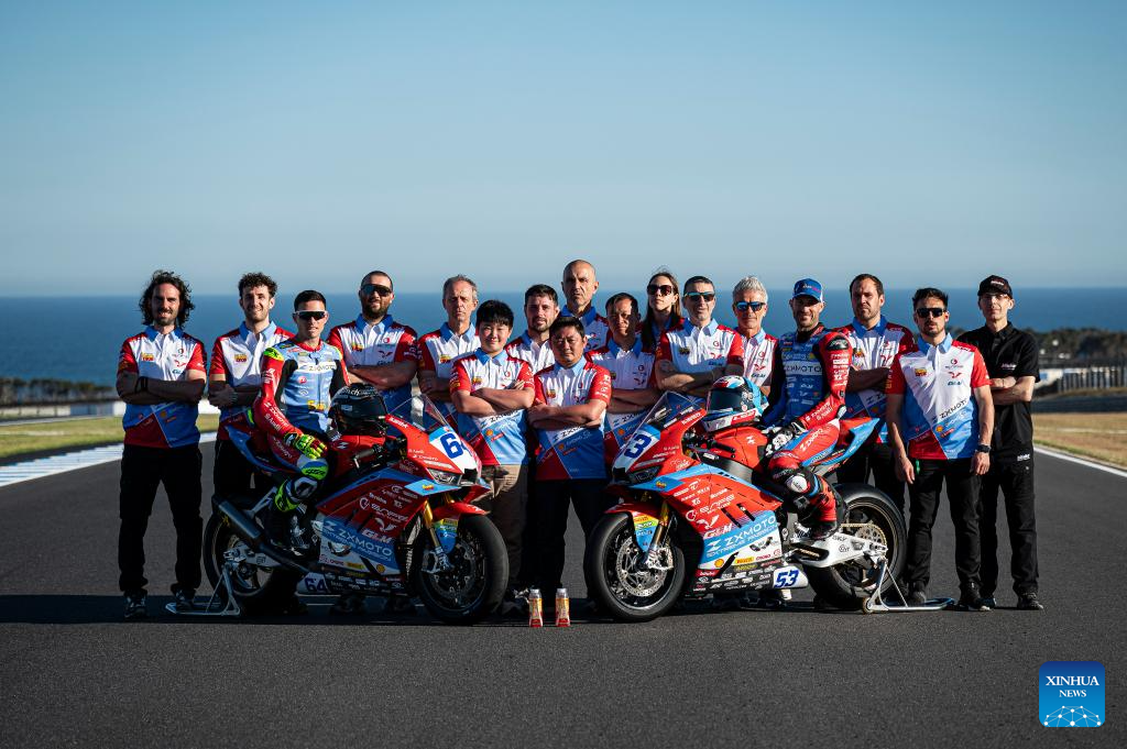 Zhang Xue (C), founder of Chinese motorcycle manufacturer ZXMOTO, takes a group photo with team riders at Phillip Island Grand Prix Circuit in Australia, Feb. 20, 2026. (Xinhua)