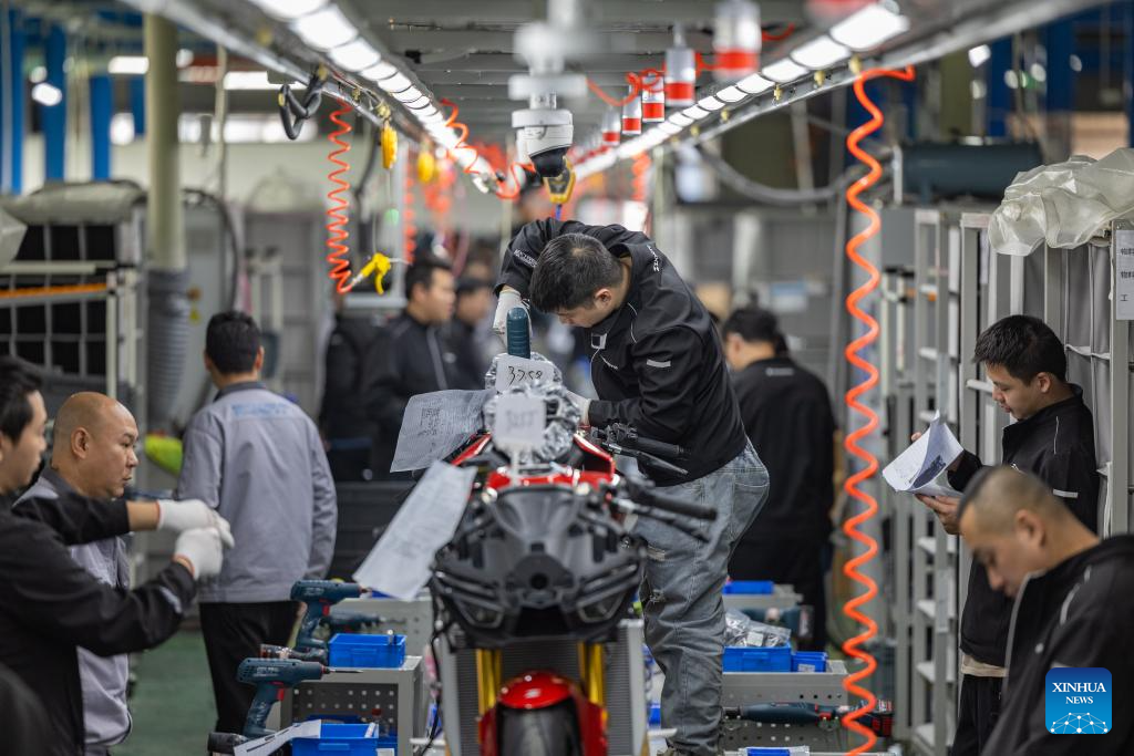 Staff members conduct inspections on motorcycles at the production workshop of ZXMOTO in Liangjiang New Area, southwest China's Chongqing, April 1, 2026.(Xinhua/Huang Wei)