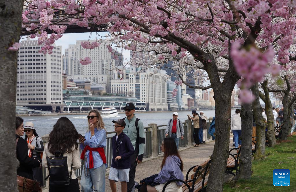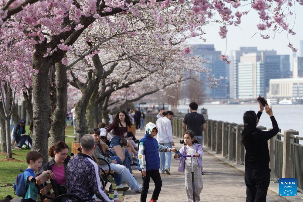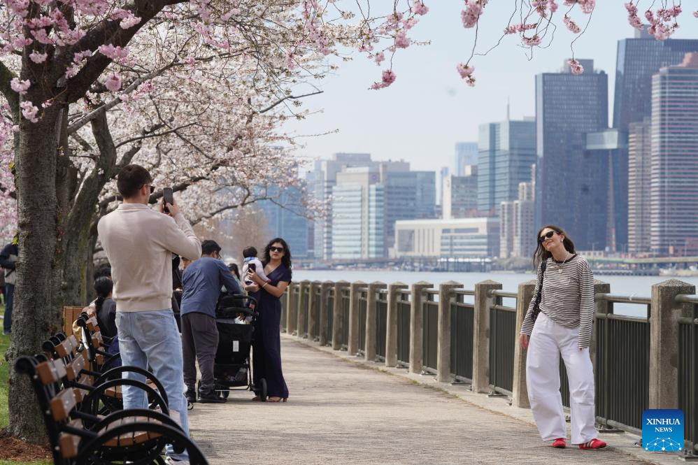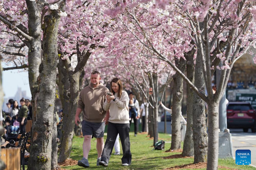 People stroll under blooming cherry trees at Roosevelt Island in New York, the United States, on April 4, 2026. (Xinhua/Zhang Fengguo)