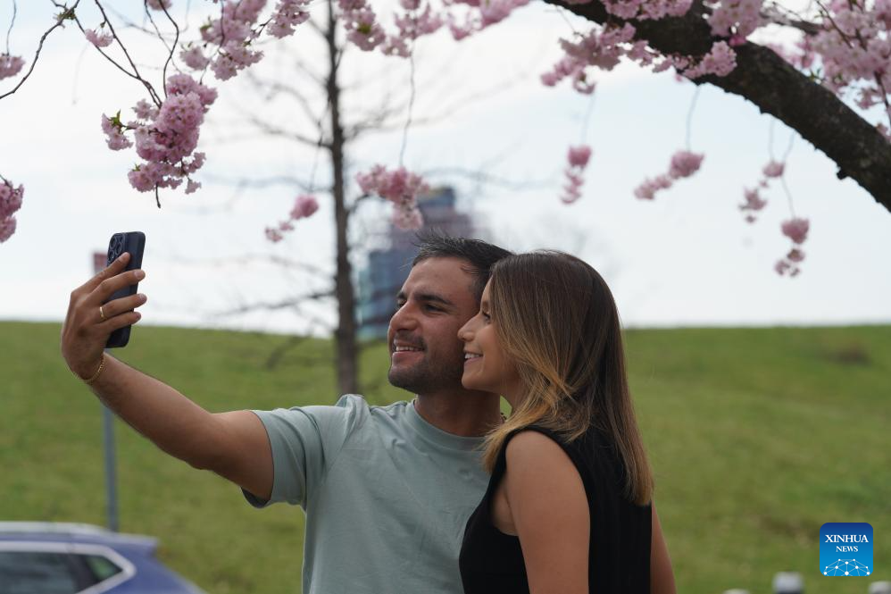 People take a selfie under blooming cherry trees at Roosevelt Island in New York, the United States, on April 4, 2026. (Xinhua/Zhang Fengguo)