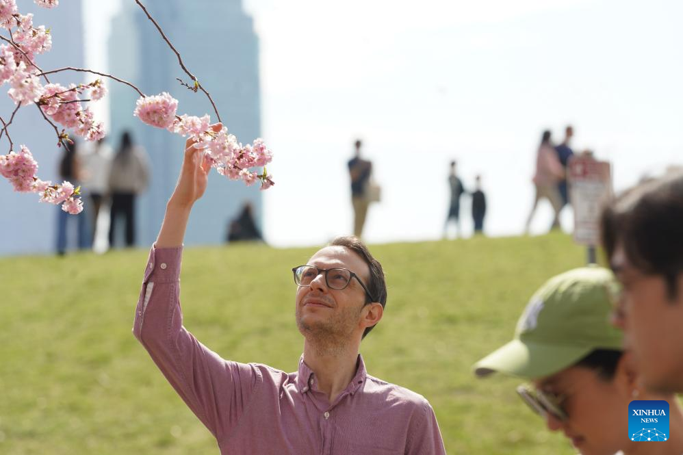 A tourist views cherry blossoms at Roosevelt Island in New York, the United States, on April 4, 2026. (Xinhua/Zhang Fengguo)
