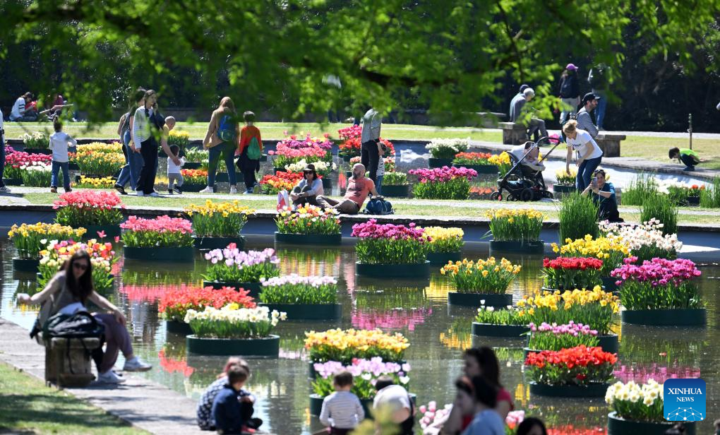 People enjoy blooming flowers at a park in Valeggio sul Mincio, Verona, Italy, April 4, 2026. (Photo by Alberto Lingria/Xinhua)